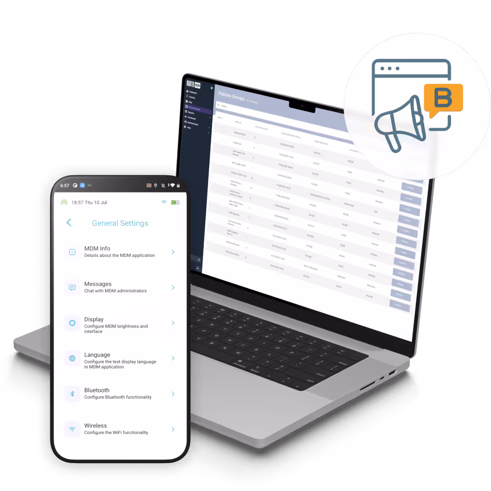It allows you to instantly push text or alerts from your MDM console to selected devices or groups - no third-party apps are required.