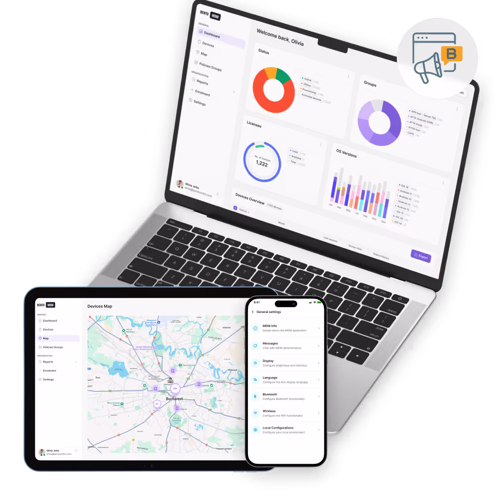Automatizează înrolarea, aplică modul Kiosk, distribuie update-uri remote, monitorizează statusul și oferă suport pentru dispozitivele kiosk dintr-o singură consolă.